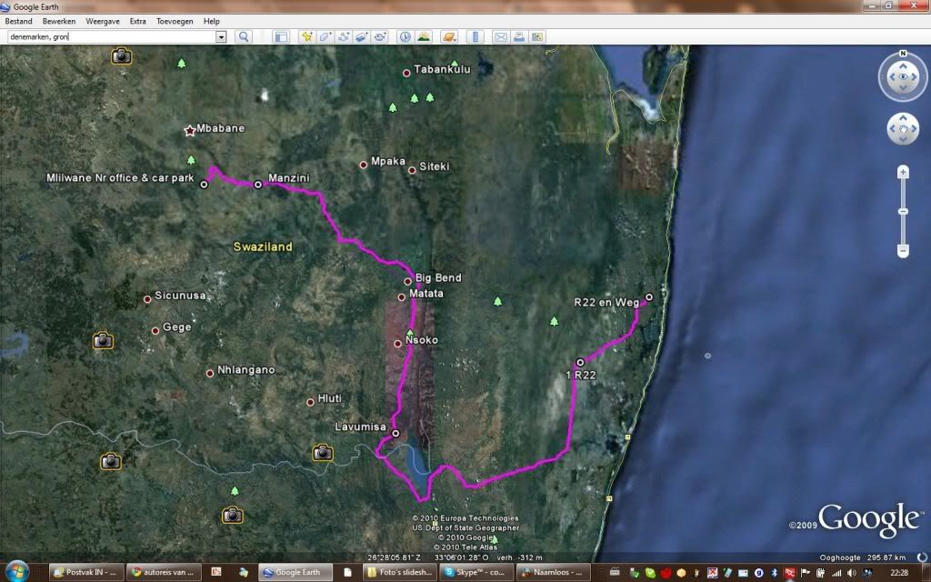 Ik heb al op Google maps gekeken, maar deze stuurt ons via de plaatsjes Ingwavuma ??? en Lismore???; duur 258 km ca. 4 uur en 37 minuten. Ik heb hier geen goed gevoel bij. Er zitten een paar rare kronkels in en volgens mij gaan we geen officiële grensovergang naar Swaziland over.