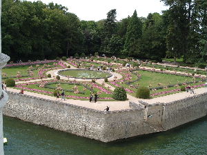 water van de Cher beschermd, Links is de tuin van Catharina de Medici, met een centrale vijver en uitzicht op de oostelijke gevel. Het planten van de stekken gebeurt elk voorjaar. De 130.000 stekken worden op het landgoed gekweekt.