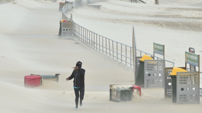 Een wandelaar probeert zich te beschermen tegen de zandstorm op Bondi Beach