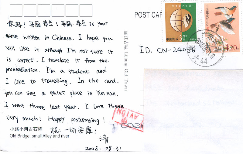 Heb vandaag een mooie kaart uit China, Lijiang, leuk hoor, ben ik zelf ook geweest in 2006. Ze heeft mijn naam erop gezet in Chinese karakters, echt SUPER!