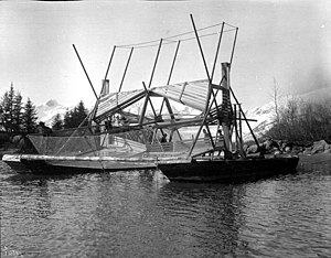 Driven by current, it runs unattended to scoop up salmon which are deposited in a basket. Legal only for Indians.