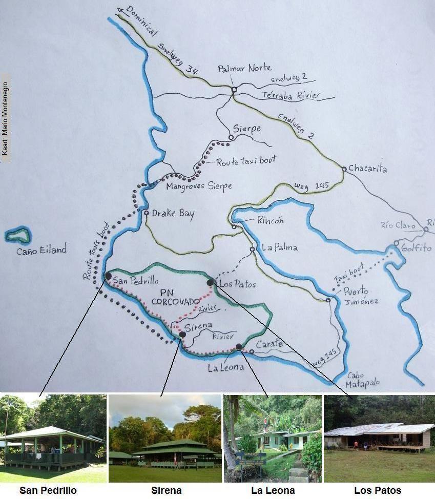 Corcovado heeft 4 rangerstations: Sirena, La Leona, Los Patos en San Pedrillo.