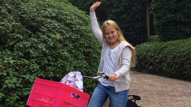 Één van onze prinsessen, Amalia, op haar fiets naar haar eerste dag op het Gym.