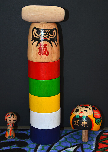 Nog wat houten spul, een magneetje, stapelpop (of hoe noem je zoiets?) en een tol die als je het goed doet uit zichzelf al draaiend op z’n kop gaat staan. Dat magneetje en die tol zijn handgemaakt en -beschilderd, dat andere ding is gewoon fabrieksspul waar m’n neefje zich op kan gaan uitleven…