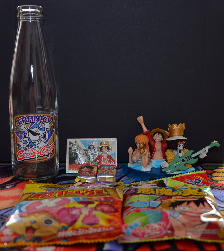Een recentere verslaving van me, manga/anime-serie One Piece, qua merchandise absoluut op eenzame hoogte (ik heb me dan ook ingehouden). Wat betreft dat colaflesje, Franky is een personage uit die reeks, een cyborg aangedreven door jawel, cola. In Fukuoka gekocht tijdens de (lange) tussenstop op de heenweg, en met een veiligheidscontrole in het vooruitzicht heb ik die cola dus maar opgedronken. Dat was dus nergens voor nodig geweest, in Japan hebben ze gewoon een scanner om te controleren of vloeistoffen gevaarlijk zijn…